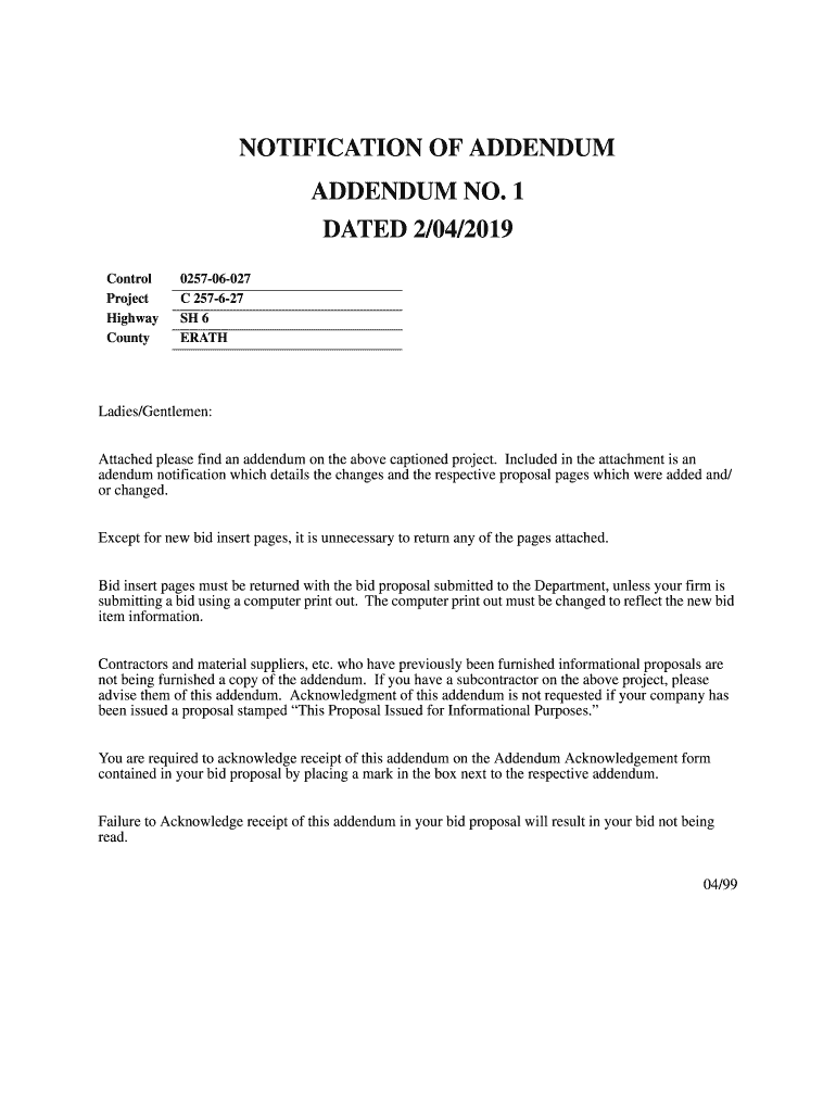 Get the free NOTIFICATION OF ADDENDUM ADDENDUM NO. 1 DATED 2/04/2019 - ftp dot state tx