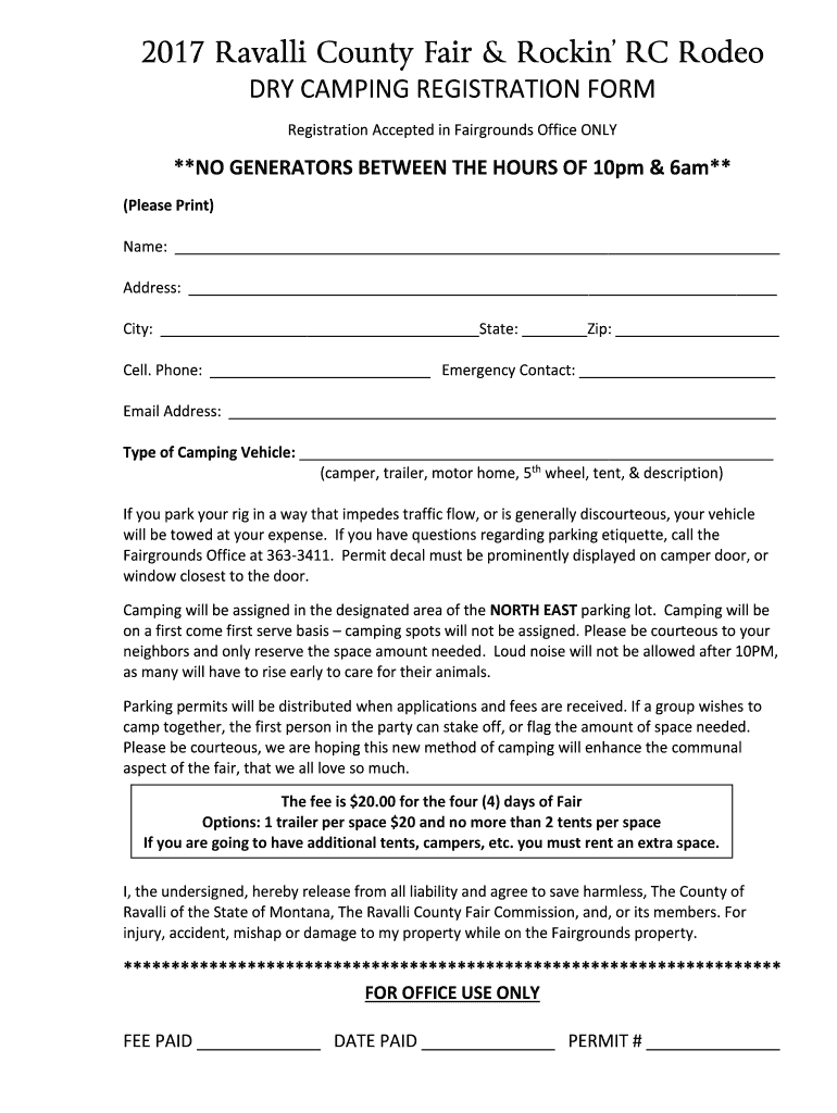 2017 Ravioli County Fair & Rocking RC Rodeo DRY CAMPING REGISTRATION FORM Registration Accepted in Fairgrounds Office ONLY**NO GENERATORS BETWEEN THE HOURS OF 10pm & 6am** (Please Print) Name: Address: