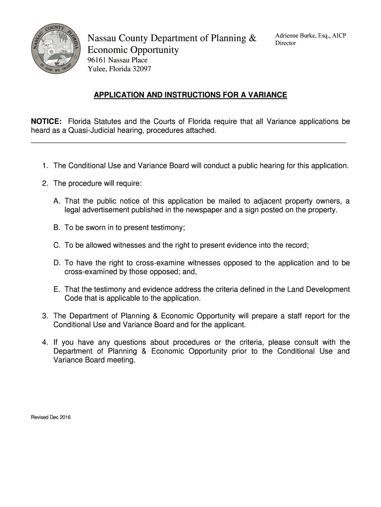 Nassau County Department of Planning & Economic Opportunity Adrienne Burke, Esq., ICP Director96161 Nassau Place Yule, Florida 32097 APPLICATION AND INSTRUCTIONS FOR A VARIANCENOTICE: Florida Statutes