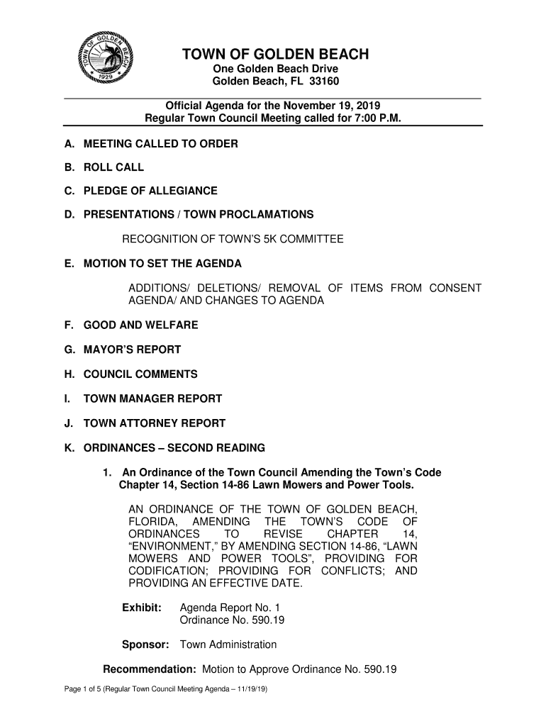 TOWN OF GOLDEN BEACH One Golden Beach Drive Golden Beach, FL 33160 Official Agenda for the November 19, 2019, Regular Town Council Meeting called for 7:00 P.M. A. MEETING CALLED TO ORDER B. ROLL CALL