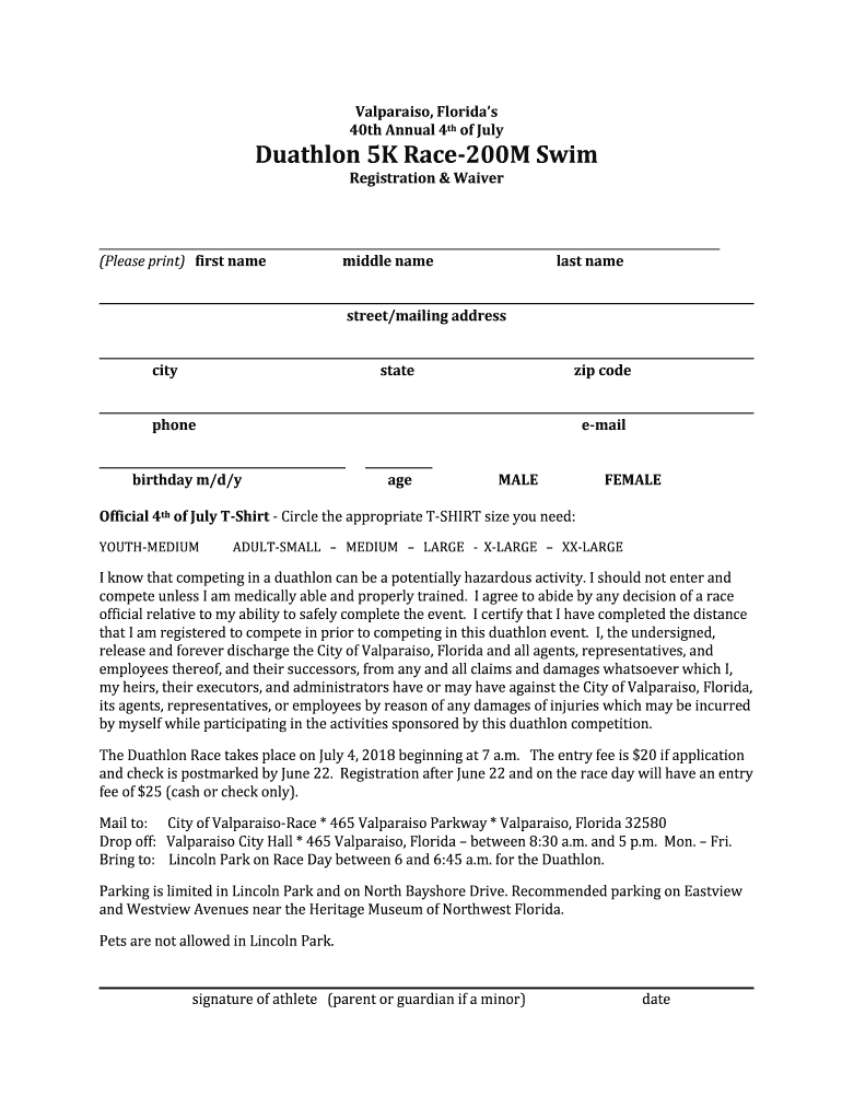 Valparaiso, Florida's 40th Annual 4th of JulyDuathlon 5K Race200M Swim Registration & Waiver (Please print) first name middle name last name street/mailing address city state zip code phone email