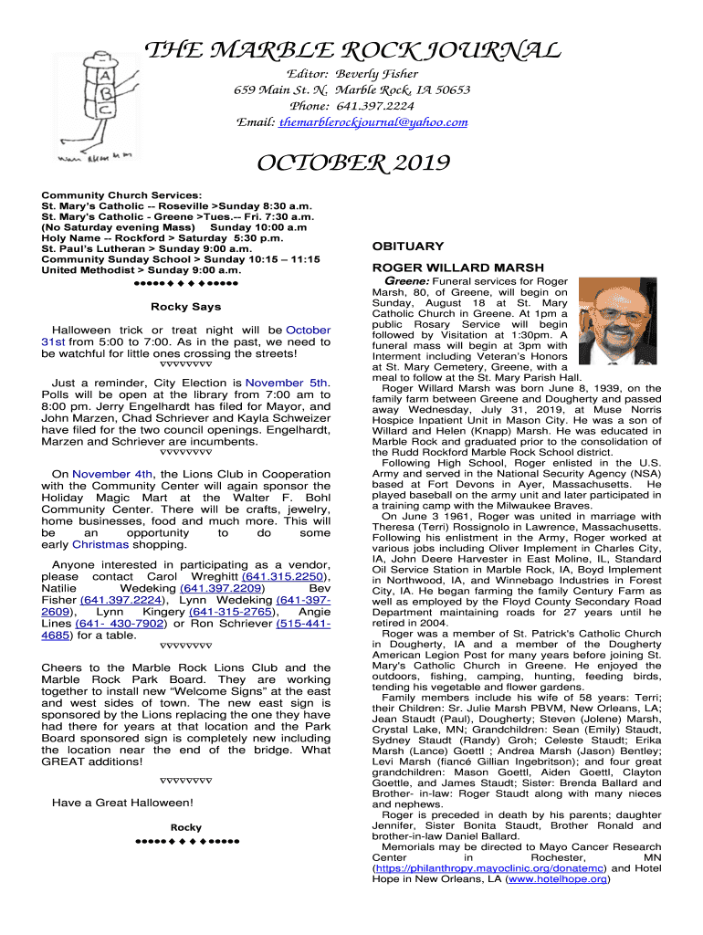 THE MARBLE ROCK JOURNAL Editor: Beverly Fisher 659 Main St. N. Marble Rock, IA 50653 Phone: 641.397.2224 Email: themarblerockjournal yahoo. October 2019 Community Church Services: St. Mary's Catholic