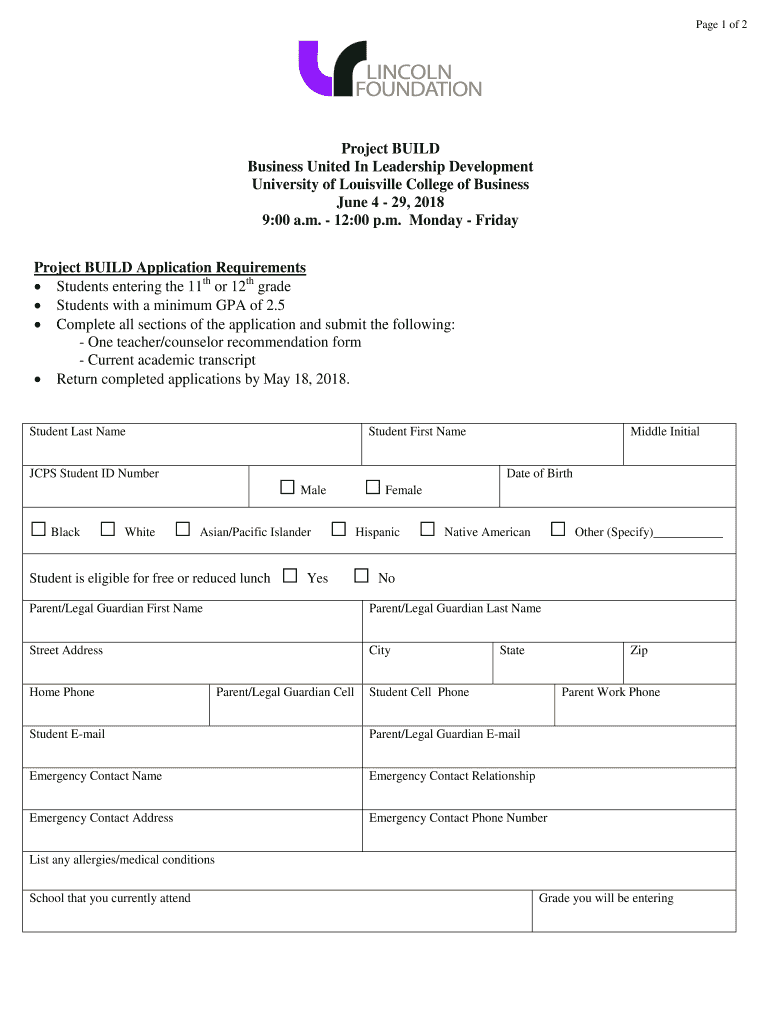 Page 1 of 2Project BUILD Business United In Leadership Development University of Louisville College of Business June 4 29, 2018 9:00 a.m. 12:00 p.m. Monday Friday Project BUILD Application Requirements
