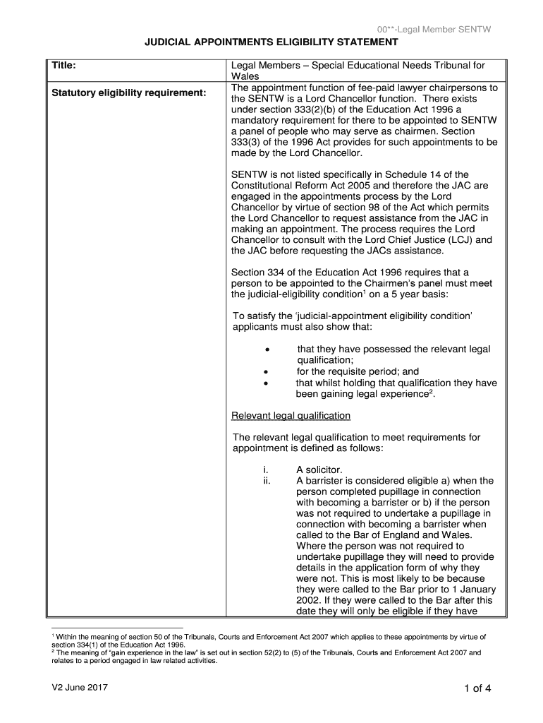 00**Legal Member SENTWJUDICIAL APPOINTMENTS ELIGIBILITY STATEMENT Title: Statutory eligibility requirement:Legal Members Special Educational Needs Tribunal for Wales The appointment function of fee