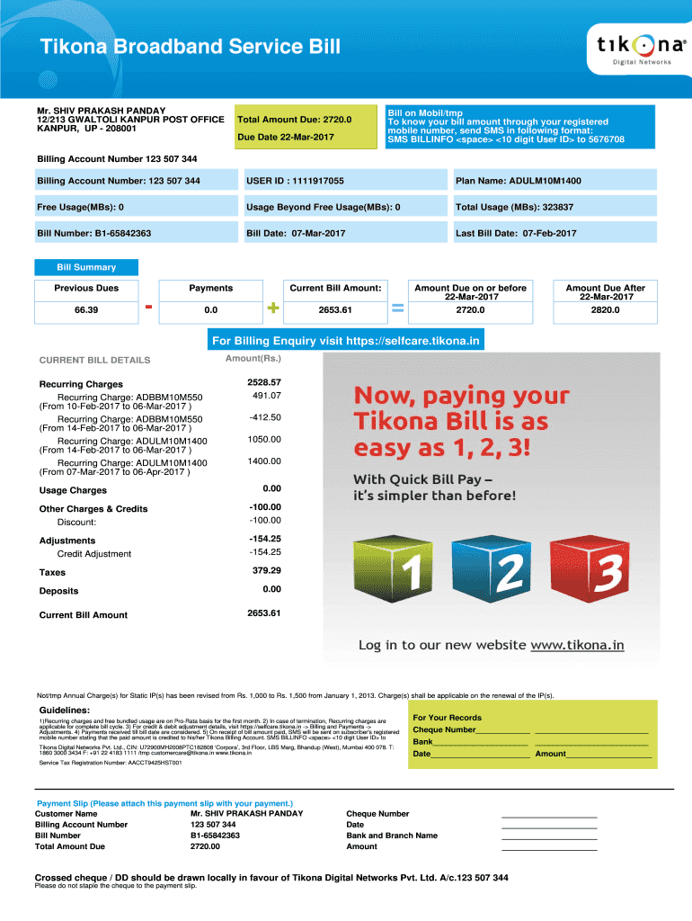 Mr. SHIV PRAKASH PANDA 12/213 WALTON KANPUR POST OFFICE KANPUR, UP 208001Total Amount Due: 2720.0 Due Date 22Mar2017Bill on Mobil/tmp To know your bill amount through your registered mobile number,