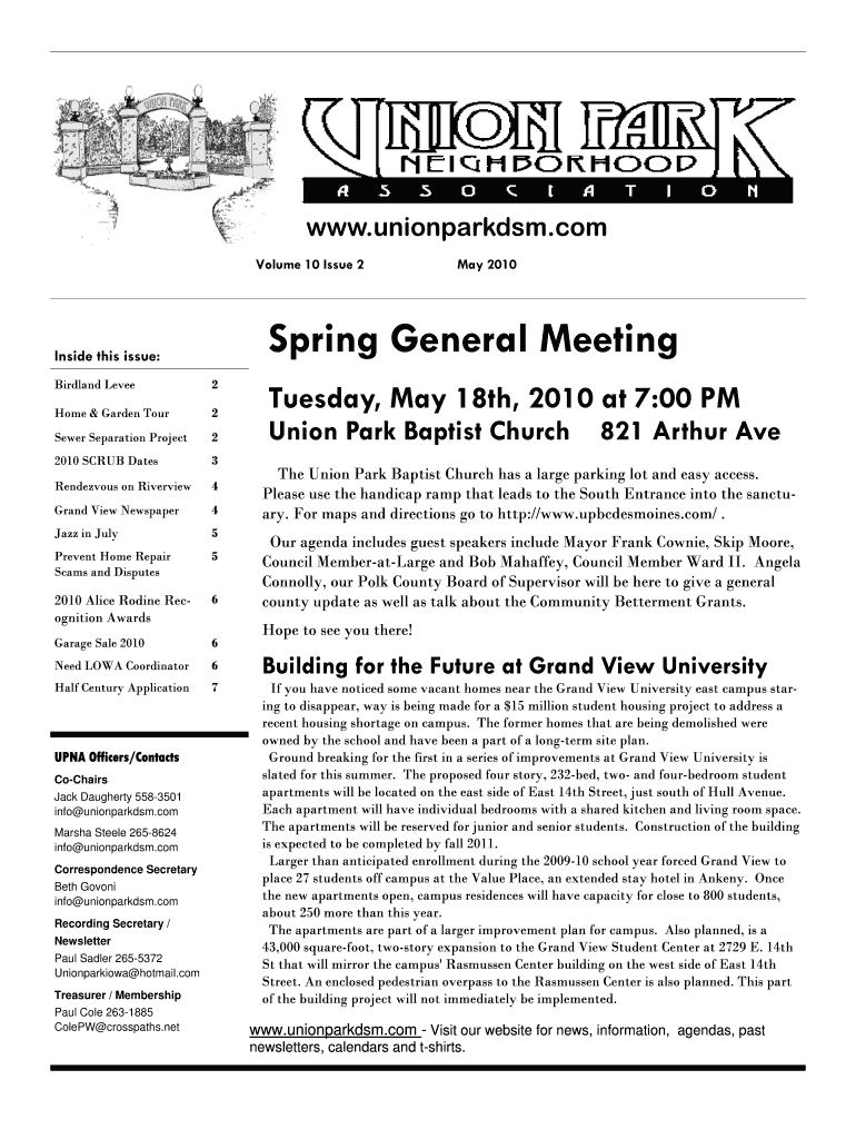 WWW.unionparkdsm.com Volume 10 Issue 2Spring General MeetingInside this issue: Bird land Levee2Home & Garden Tour2Sewer Separation Project22010 SCRUB Dates3Rendezvous on Riverview4Grand View Newspaper4Jazz