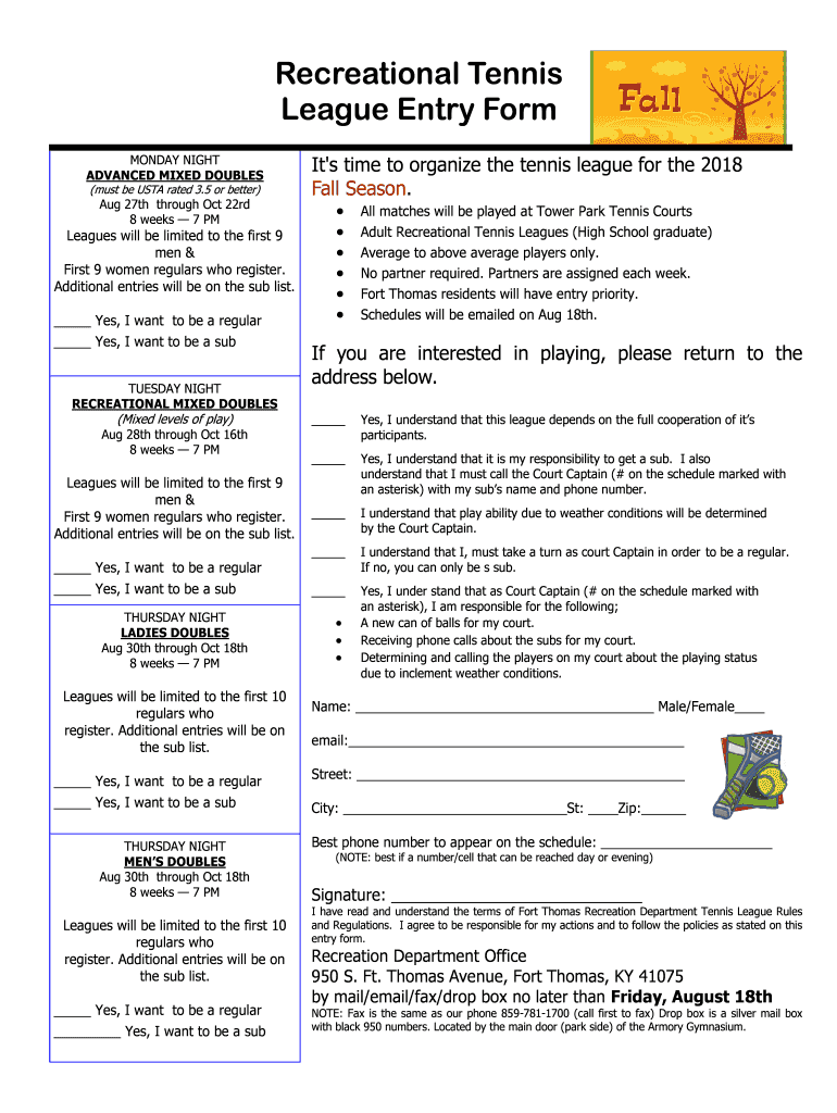 Recreational Tennis League Entry Form MONDAY NIGHT ADVANCED MIXED DOUBLES (must be USTA rated 3.5 or better)Aug 27th through Oct 22nd 8 weeks 7 Leagues will be limited to the first 9 men & First 9
