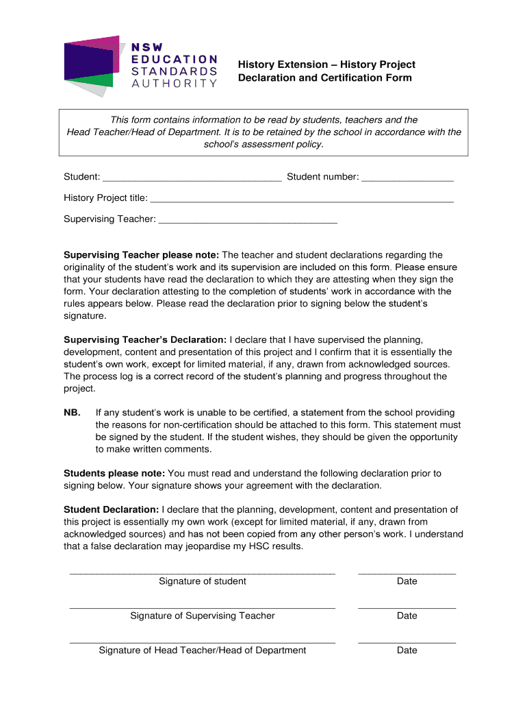 History Extension History Project Declaration and Certification Forms form contains information to be read by students, teachers and the Head Teacher/Head of Department. It is to be retained by the