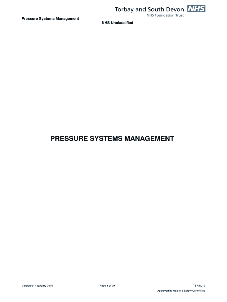 Pressure Systems Management NHS UnclassifiedPRESSURE SYSTEMS MANAGEMENTVersion 01 / January 2016Page 1 of 29TSP/S012 Approved by Health & Safety CommitteePressure Systems Management NHS Unclassified