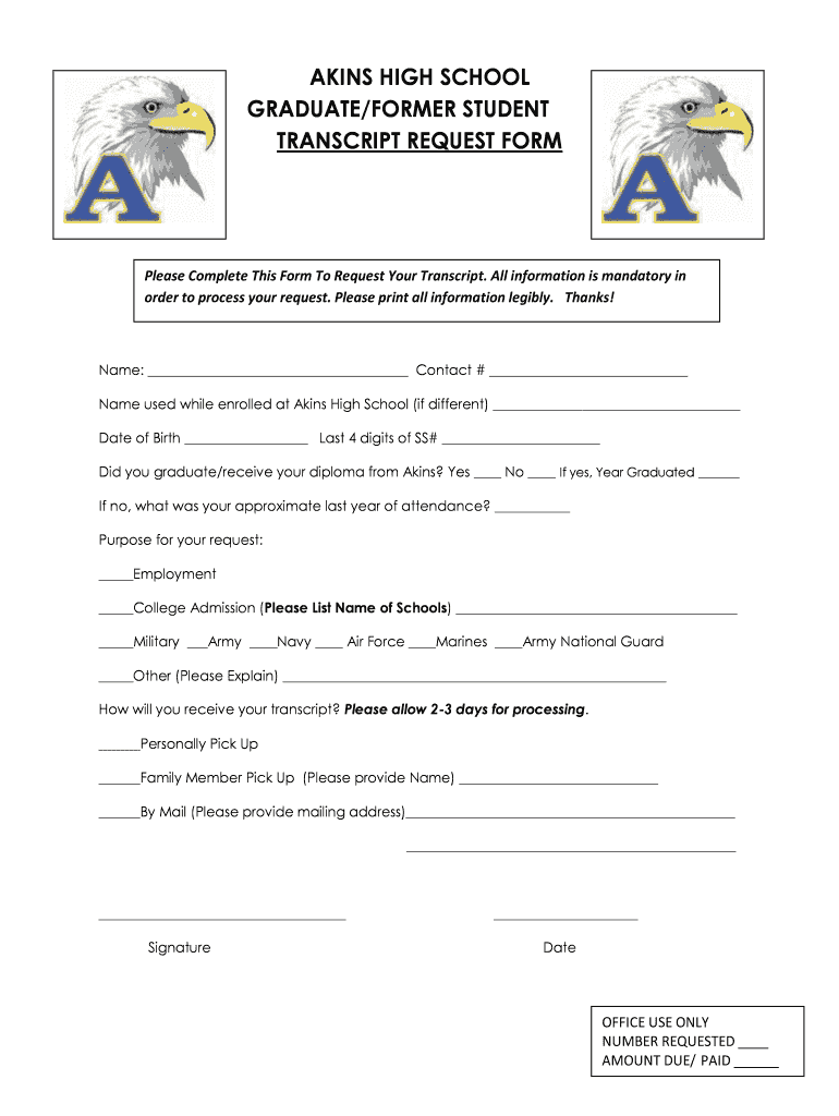 AKINS HIGH SCHOOL GRADUATE/FORMER STUDENT TRANSCRIPT REQUEST Formulas Complete This Form To Request Your Transcript. All information is mandatory in order to process your request. Please print all