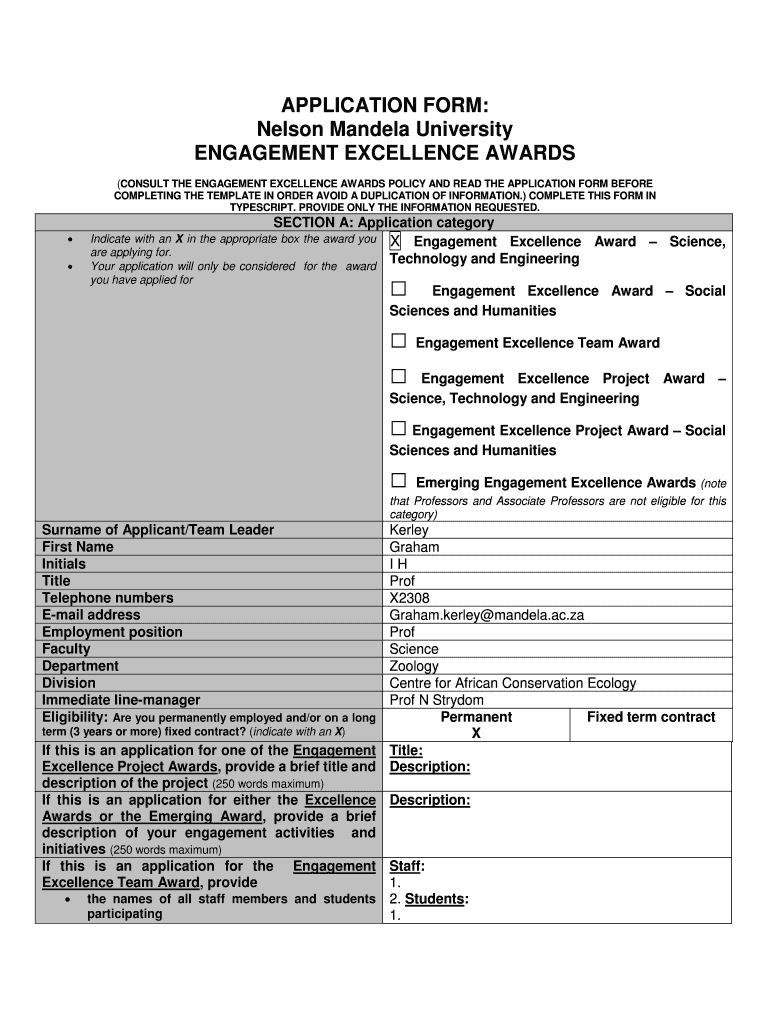 APPLICATION FORM: Nelson Mandela University ENGAGEMENT EXCELLENCE AWARDS (CONSULT THE ENGAGEMENT EXCELLENCE AWARDS POLICY AND READ THE APPLICATION FORM BEFORE COMPLETING THE TEMPLATE IN ORDER AVOID