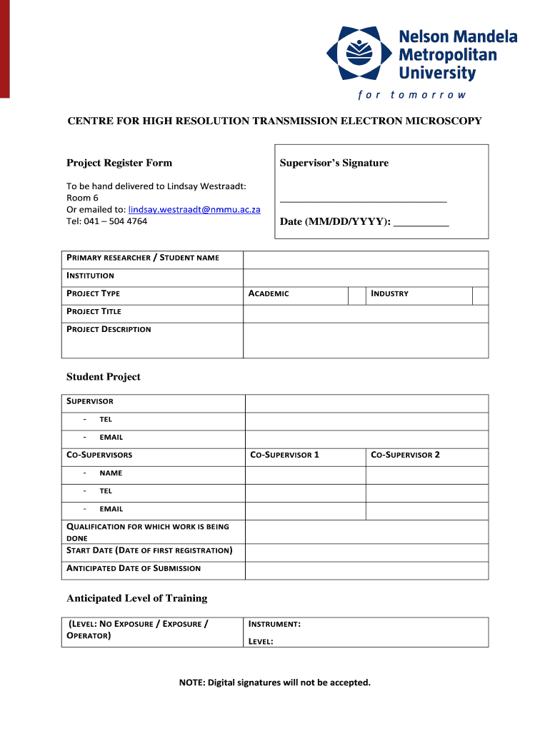 Center FOR HIGH RESOLUTION TRANSMISSION ELECTRON MICROSCOPYProject Register FormSupervisors Signature be hand delivered to Lindsay Westward: Room 6 Or emailed to: Lindsay. Westward MMU.ac.ZA Tel: