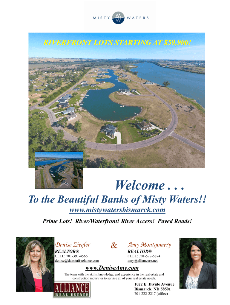 RIVERFRONT LOTS STARTING AT $59,900! Welcome. . . To the Beautiful Banks of Misty Waters!! www.mistywatersbismarck.com Prime Lots! River/Waterfront! River Access! Paved Roads! Denise Ziegler REALTOR