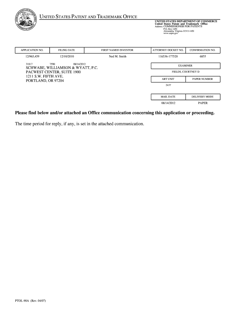 UNITED STATES PATENT AND TRADEMARK OFFICE UNITED STATES DEPARTMENT OF COMMERCE United States Patent and Trademark Office Address: COMMISSIONER FOR PATENTS P.O. Box 1450 Alexandria, Virginia 223131450