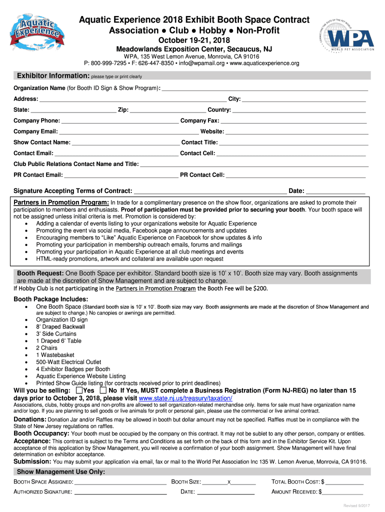 Aquatic Experience 2018 Exhibit Booth Space Contract Association Club Hobby Nonprofit October 1921, 2018 Meadowlands Exposition Center, Secaucus, NJ WPA, 135 West Lemon Avenue, Monrovia, CA 91016