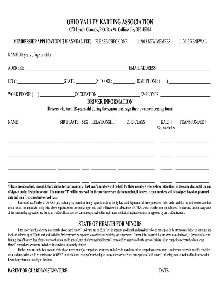 OHIO VALLEY KARTING ASSOCIATION C/O Lynda Combs, P.O. Box 94, Collinsville, OH 45004 MEMBERSHIP APPLICATION ($35 ANNUAL FEE)PLEASE CHECK ONE: 2013 NEW MEMBER 2013 RENEWALNAME (18 years of age or older):