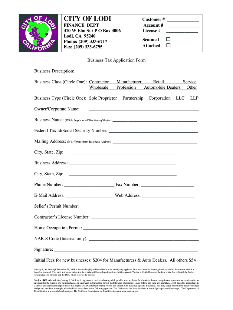 CITY OF LODI FINANCE DEPT 310 W Elm St / P O Box 3006 Lodi, CA 95240 Phone: (209) 3336717 Fax: (209) 3336795Customer # Account # License # Scanned Attached Business Tax Application Form Business Description: