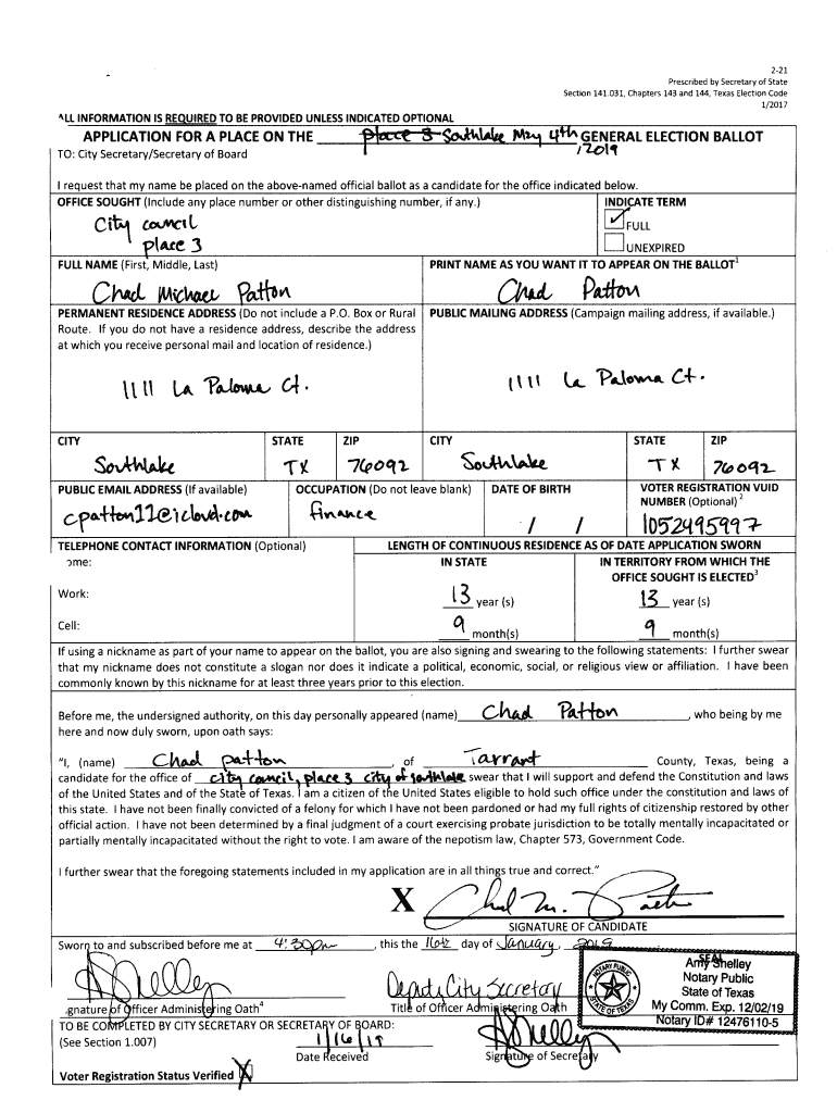 2 21Prescribed by Secretary of State Section 141. 031, Chapters 143 and 144, Texas Election Code 10/ 2016a IN&fihlJCTiaN fan application to have the name of a candidate placed on the ballot for any