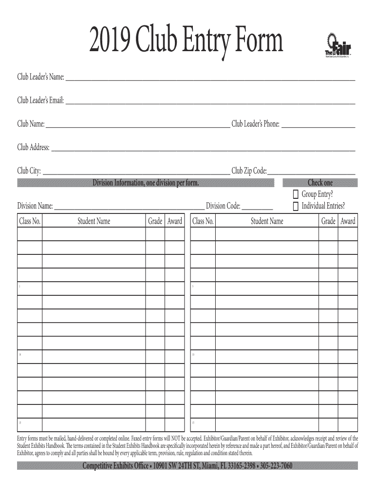 2019 Club Entry Form Club Leaders Name: Club Leaders Email: Club Name: Club Leaders Phone: Club Address: Club City: Club Zip Code: Division Information, one division per form. Check one Group Entry?