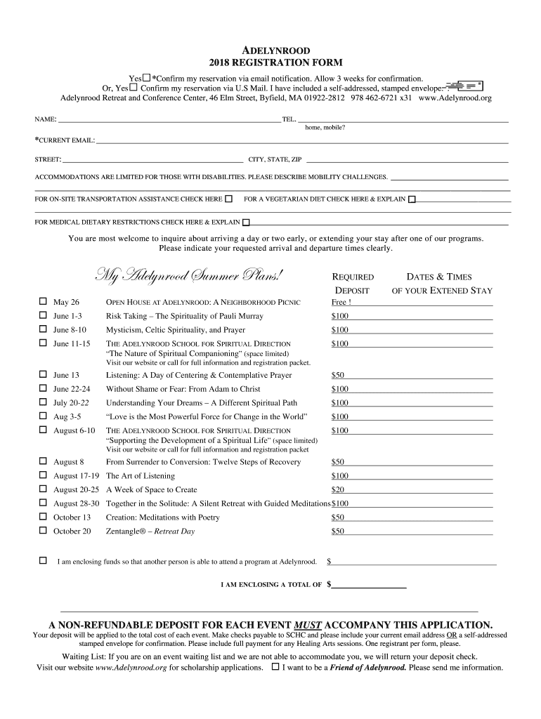 ADELYNROOD 2018 REGISTRATION FORM Yes o *Confirm my reservation via email notification. Allow 3 weeks for confirmation. Or, Yes to Confirm my reservation via U.S. Mail. I have included a self-addressed,