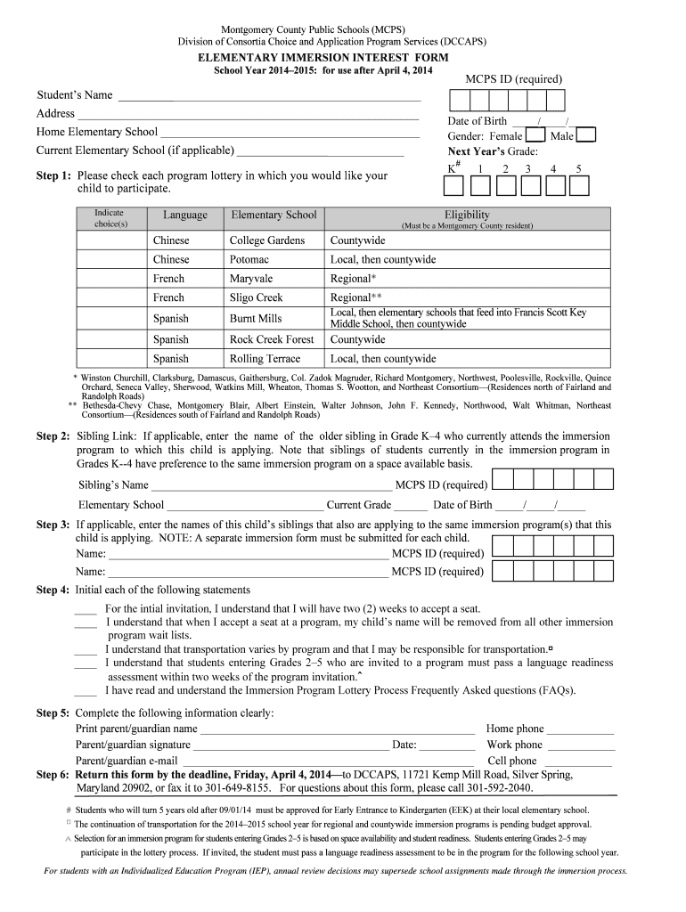 MONTGOMERY COUNTY PUBLIC SCHOOLS Division of Consortia Choice and Application Program Services Spring Mill Field Office 11721 Kemp Mill Road Silver Spring, Maryland 20902 Phone: 3015922040 FAX: 3016498155