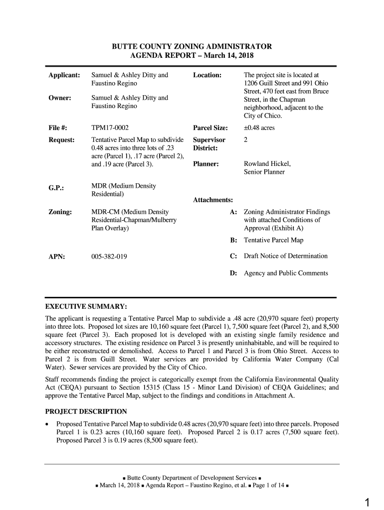 BUTTE COUNTY ZONING ADMINISTRATOR AGENDA REPORT March 14, 2018, Applicant:Samuel & Ashley Ditty and Faustino ReginoOwner:Samuel & Ashley Ditty and Faustino ReginoFile #: Request:G.P.: Zoning:Location:The