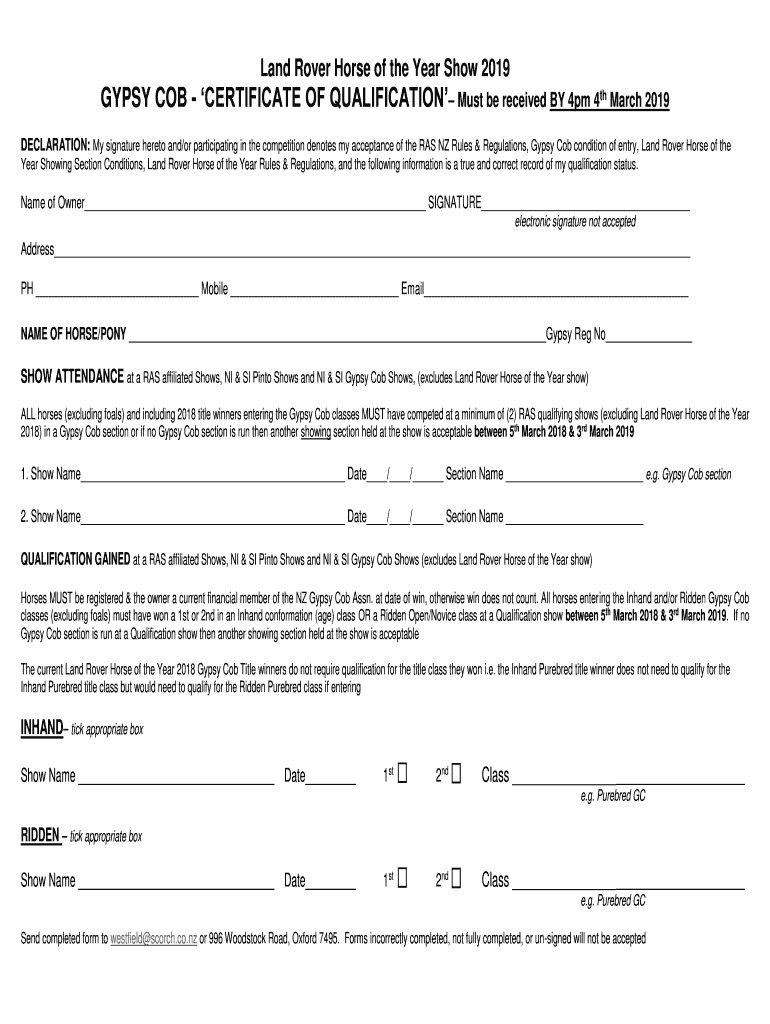 Land Rover Horse of the Year Show 2019GYPSY COB CERTIFICATE OF QUALIFICATION Must be received BY 4pm 4th March 2019 DECLARATION: My signature hereto and/or participating in the competition denotes