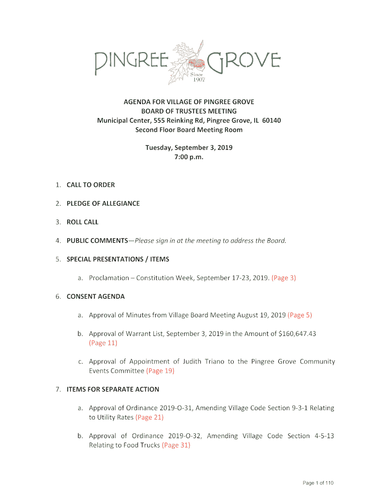 AGENDA FOR VILLAGE OF INGRES GROVE BOARD OF TRUSTEES MEETING Municipal Center, 555 Ranking Rd, Ingres Grove, IL 60140 Second Floor Board Meeting Room Tuesday, September 3, 2019 7:00 p.m. 1. CALL TO
