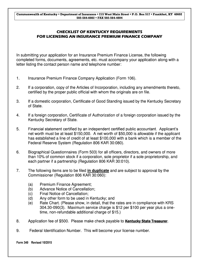 Commonwealth of Kentucky Department of Insurance 215 West Main Street P.O. Box 517 Frankfort, KY 40602 5025646082 FAX 5025644604CHECKLIST OF KENTUCKY REQUIREMENTS FOR LICENSING AN INSURANCE PREMIUM