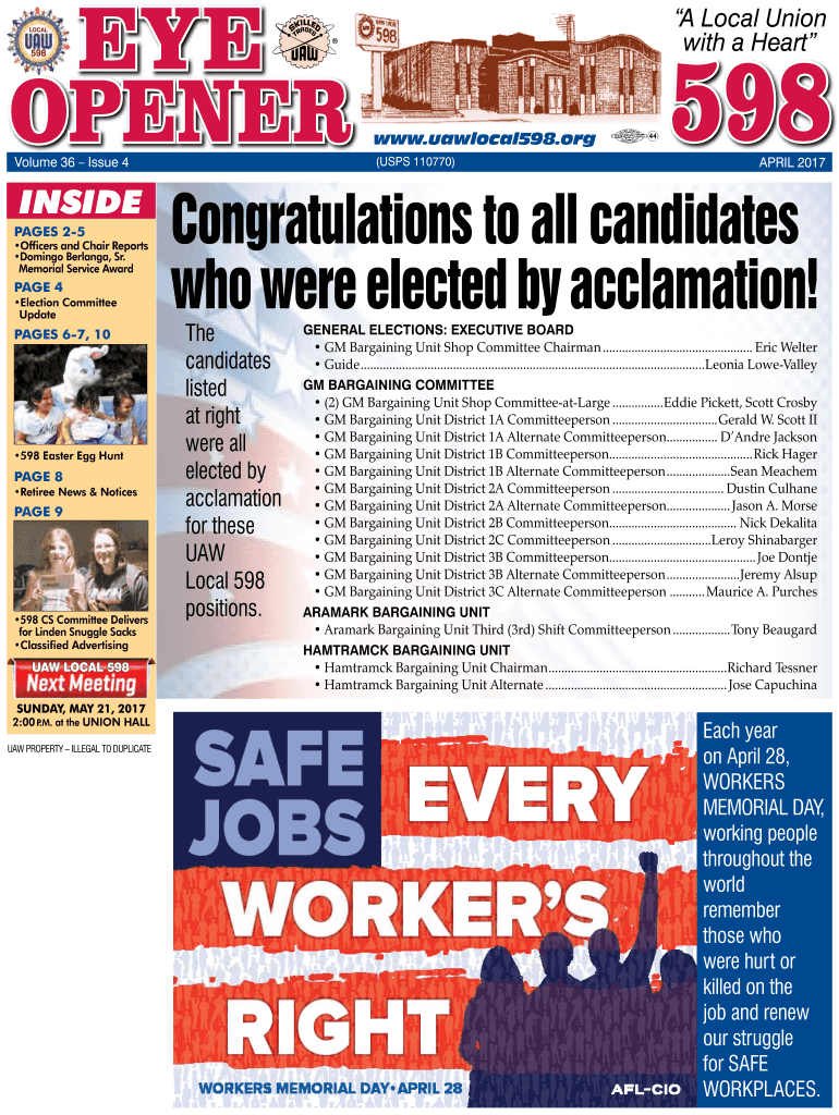 EYE OPENER Local Union with a HeartLOCAL598Volume 36 Issue 4Inside Pages 25Officers and Chair Reports Domingo Erlang, Sr. Memorial Service Award Page 4 Election Committee UpdatePageS 67, 10598 Easter