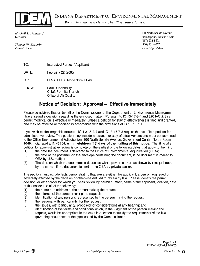 IN DIANA D DEPARTMENT OF E ENVIRONMENTAL M MANAGEMENT We make Indiana a cleaner, healthier place to live. 100 North Senate Avenue Indianapolis, Indiana 46204 (317) 2328603 (800) 4516027 www.IN.gov/idemMitchell
