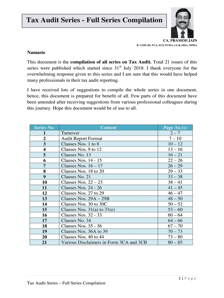 Tax Audit Series Full Series Compilation CA. STROLLER OD JAIN B. COM (H), FCA, FCS, CMA, LL.B, DISA, MIMANamaste This document is the compilation of all series on Tax Audit. Total 21 issues of this