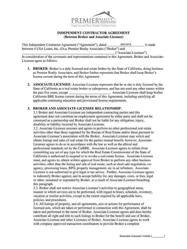 INDEPENDENT CONTRACTOR AGREEMENT (Between Broker and AssociateLicensee) 05/01/2018 This Independent Contractor Agreement (Agreement), dated is made between 4 USA Loans, Inc. d.b.a. Premier Realty
