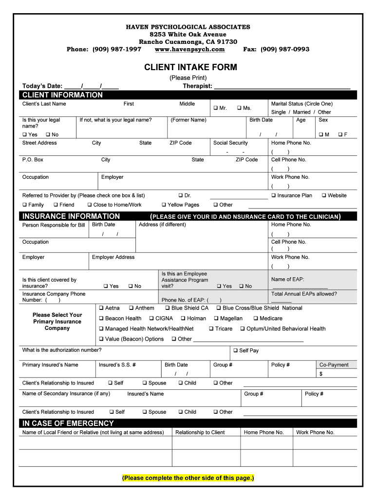 HAVEN PSYCHOLOGICAL ASSOCIATES 8253 White Oak Avenue Rancho Cucamonga, CA 91730 Phone: (909) 9871997 www.havenpsych.com Fax: (909) 9870993CLIENT INTAKE FORM (Please Print) Therapist: Today's Date: