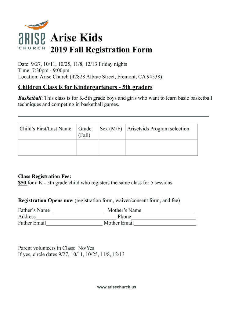 Arise Kids 2019 Fall Registration Form Date: 9/27, 10/11, 10/25, 11/8, 12/13 Friday nights Time: 7:30pm 9:00pm Location: Arise Church (42828 Albrae Street, Fremont, CA 94538)Children Class is for