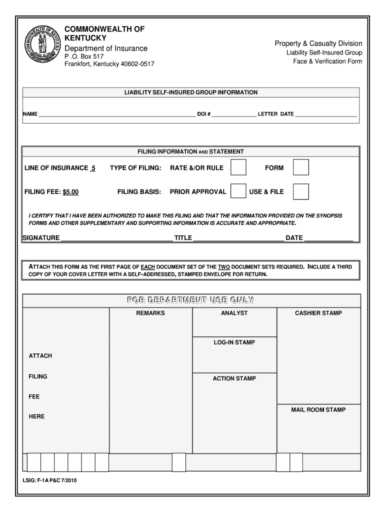 COMMONWEALTH OF KENTUCKY Department of InsuranceProperty & Casualty Division Liability Reinsured Group Face & Verification Form. O. Box 517 Frankfort, Kentucky 406020517LIABILITY REINSURED GROUP INFORMATIONAL