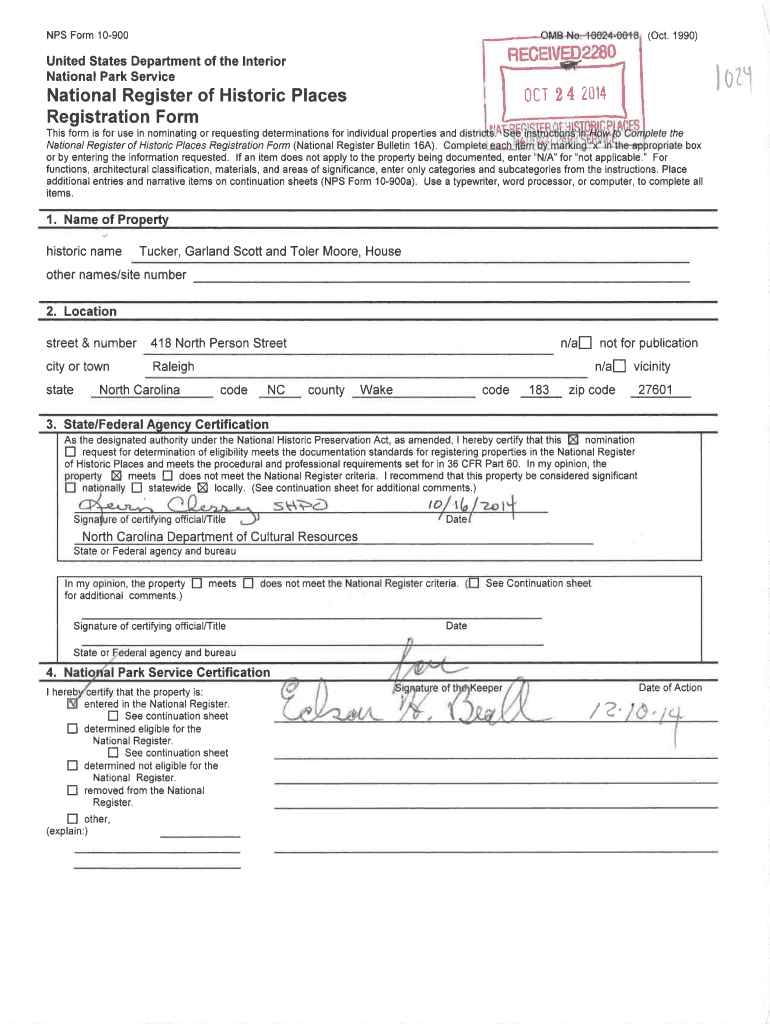 (Oct.1990)NPS Form 10900United States Department of the interior National Park SeviceNational Register of Historic Places Registration Format 24lotl2Ul4This form is for use in nominating or requesting