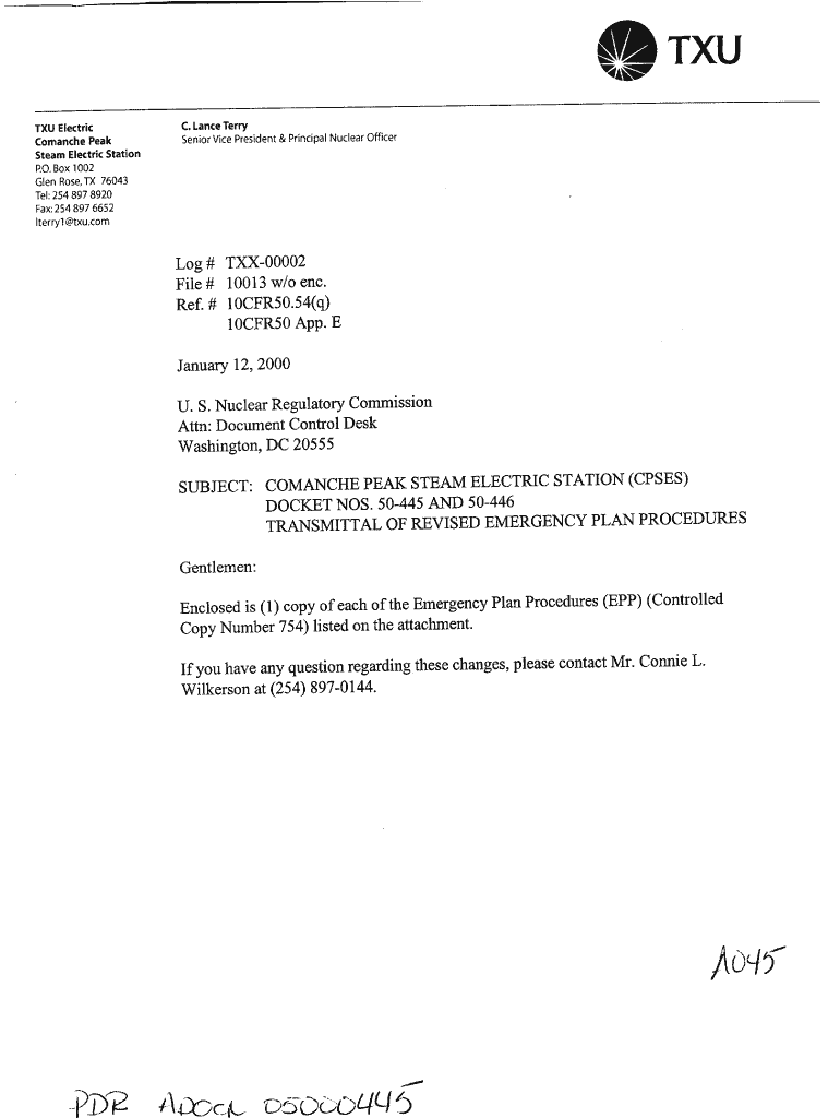 W TAU Electric Comanche Peak Steam Electric Station P.O. Box 1002 Glen Rose, TX 76043 Tel: 254 897 8920 Fax: 254 897 6652 Terry tau.comic. Lance Terry Senior Vice President & Principal Nuclear Officer