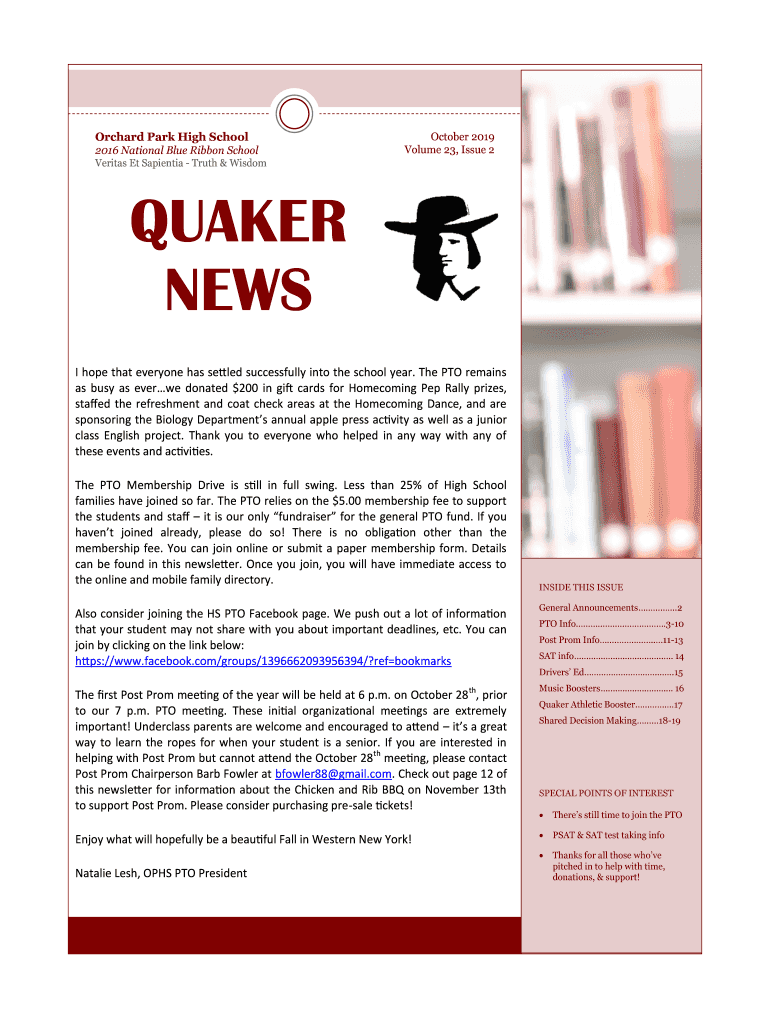 Orchard Park High School 2016 National Blue Ribbon School October 2019 Volume 23, Issue 2Veritas Et Sapient Truth & WisdomQUAKER NEWS I hope that everyone has settled successfully into the school