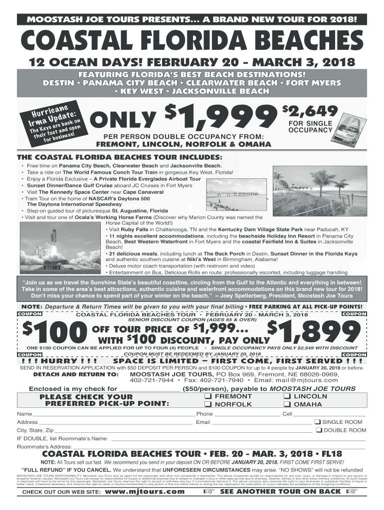 MOORISH JOE TOURS PRESENTS A BRAND-NEW TOUR FOR 2018!COASTAL FLORIDA BEACHES 12 OCEAN DAYS! FEBRUARY 20 MARCH 3, 2018, FEATURING FLORIDA BEST BEACH DESTINATIONS! DESTINY PANAMA CITY BEACH CLEARWATER