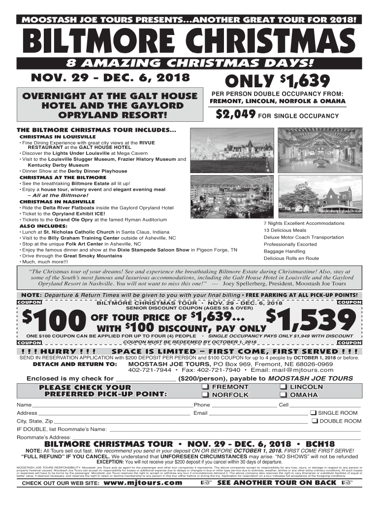 MOORISH JOE TOURS PRESENTSANOTHER GREAT TOUR FOR 2018!BILTMORE CHRISTMAS 8 AMAZING CHRISTMAS DAYS! NOV. 29 DEC. 6, $2018OVERNIGHT AT THE SALT HOUSE HOTEL AND THE GAYLORD MARYLAND RESORT!ONLY 1,639PER