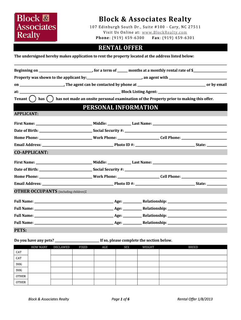 Block & Associates Realty 107 Ed in burgh So Utah Dr., S u it e ×100 — Cary, N C 27511 V is it Us online at : www.B lock R east y.com pH one : (919) 459 -6300 F ax: (919) 459 -6301 RENTAL OFFER