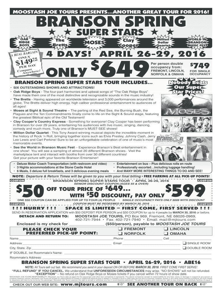MOORISH JOE TOURS PRESENTSANOTHER GREAT TOUR FOR 2016!BRANSON SPRING H superstars HH OAK RIDGE BOYS Health Brett's N! Bargain×p1er4d9ay75re Compaywhere! AnMOSESClay CooperMillion Dollar QuartetWORLD