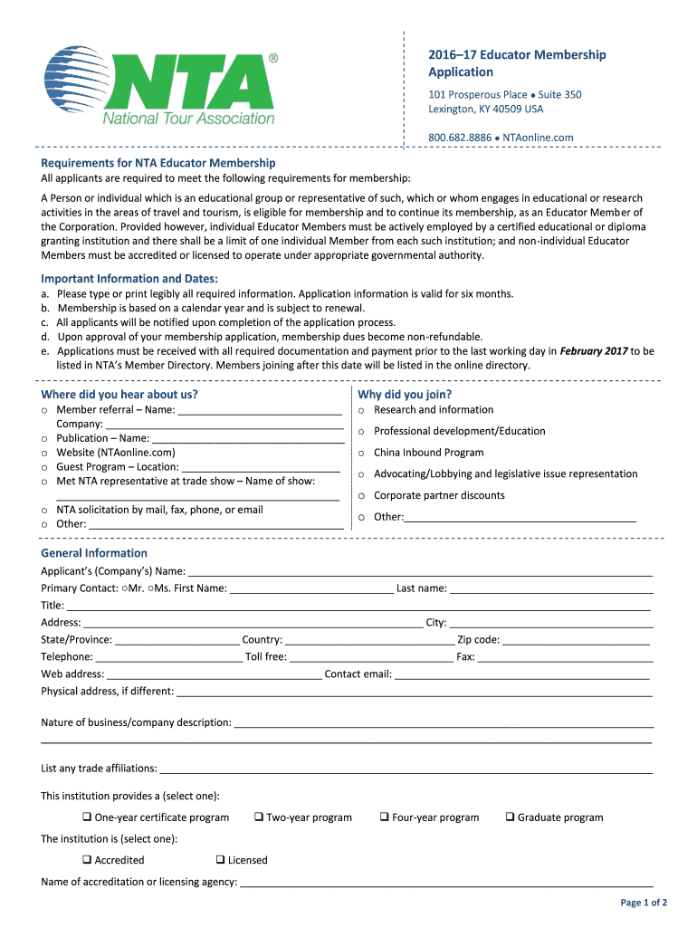 201617 Educator Membership Application 101 Prosperous Place Suite 350 Lexington, KY 40509 USA 800.682.8886 Online. Requirements for TNA Educator Membership All applicants are required to meet the
