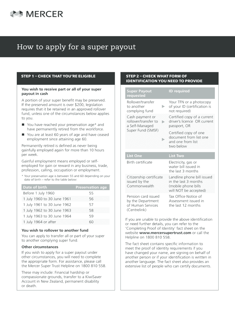 How to apply for a super payout 1 CHECK THAT YOU'RE ELIGIBLE You wish to receive part or all of your super payout in cash A portion of your super benefit may be preserved. If the preserved amount