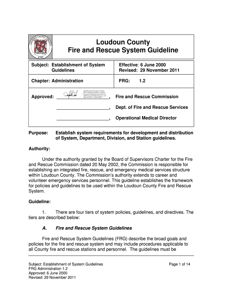 Loudoun County Fire and Rescue System Guideline Subject: Establishment of System GuidelinesEffective: 6 June 2000 Revised: 29 November 2011Chapter: Administration FRG: Digitally signed by Douglas