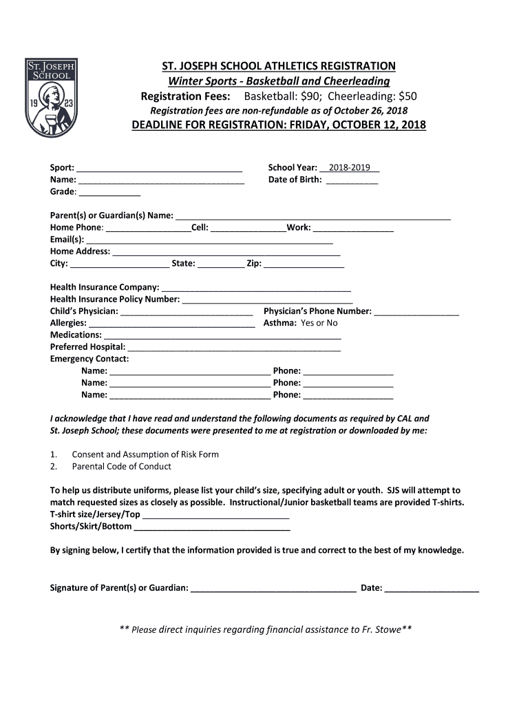ST. JOSEPH SCHOOL ATHLETICS REGISTRATION Winter Sports Basketball and Cheerleading Registration Fees: Basketball: $90; Cheerleading: $50 Registration fees are nonrefundable as of October 26, 2018DEADLINE