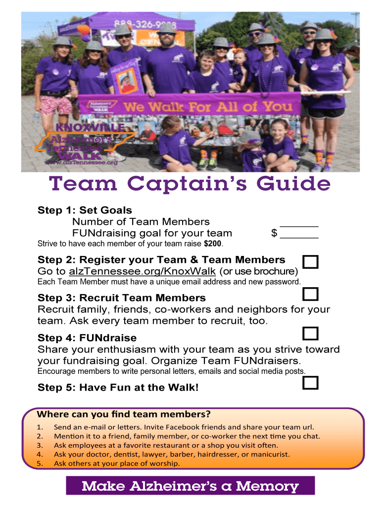 Team Captains Guide Step 1: Set Goals Number of Team Members FUNdraising goal for your team $ Strive to have each member of your team raise $200. Step 2: Register your Team & Team Members Go to alzTennessee.org/KnoxWalk