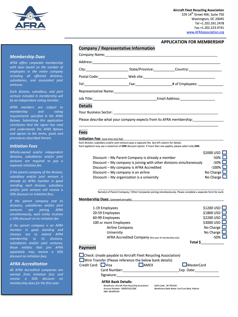 Aircraft Fleet Recycling Association TH 529 14 Street NW, Suite 750 Washington, DC 20045 Tel +1.202.591.2478 Fax +1.202.223.9741 www.AFRAassociation.orgAPPLICATION FOR MEMBERSHIP Company / Representative