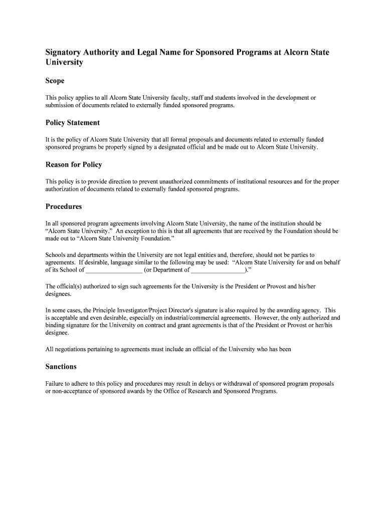 Get the free Signatory Authority and Legal Name for Sponsored Programs at Alcorn State